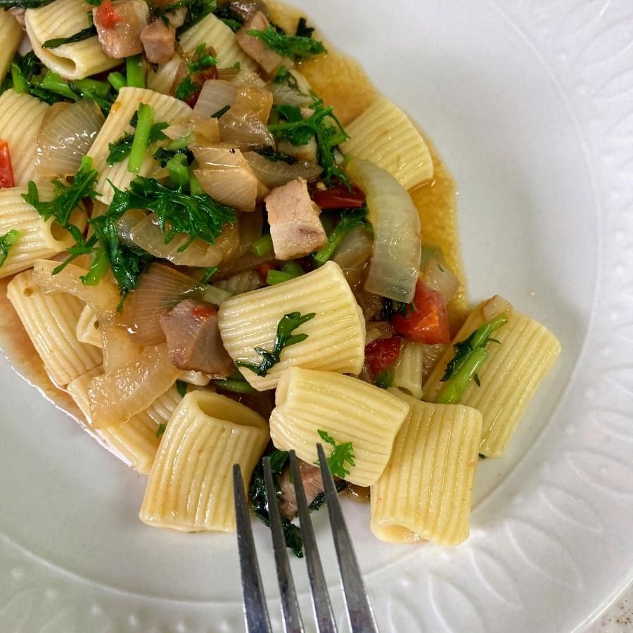 冬限定のサツマイモは、パスタに?ってよく言われますが、この唐辛子醤油の辛さと、豚肉の旨み、サツマイモの甘さ、ベストマッチです。