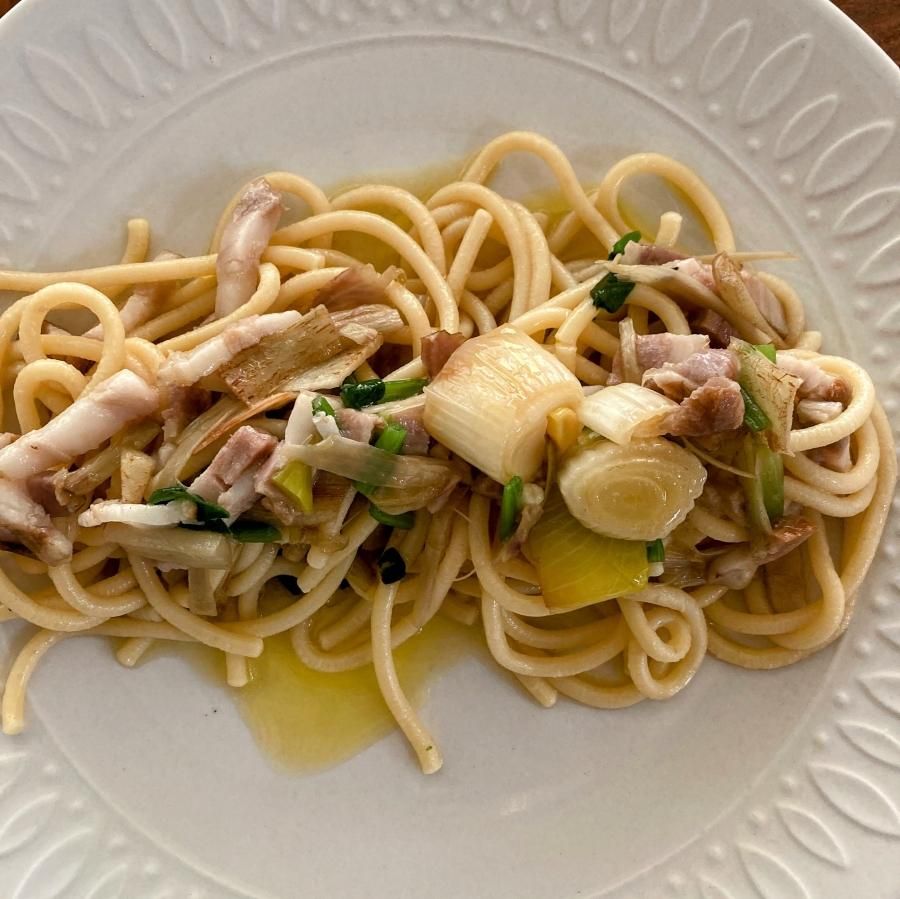 辛い!一作農園の唐辛子醤油を使ってペペロンチーノを作りました。コナリエオープン時からこの味が忘れられないと年々ファンが増え続けているオリジナルソースです。