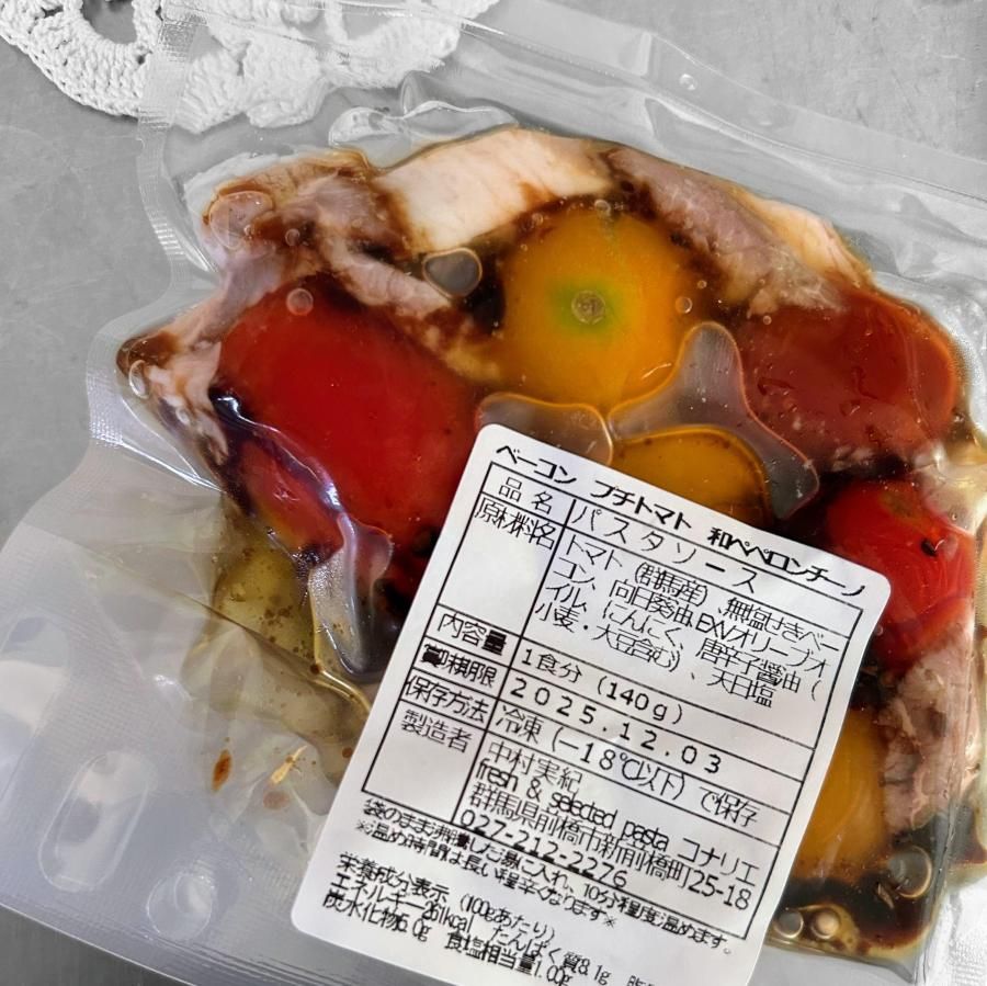 藤岡市松本さんのカラフルプチトマト・前橋市近藤さんの豚肉を使ったベーコン・向日葵オイル・EXVオリーブオイル・みなかみ町一作農園さんの唐辛子醤油(小麦・大豆含む)・国産にんにく・天日塩