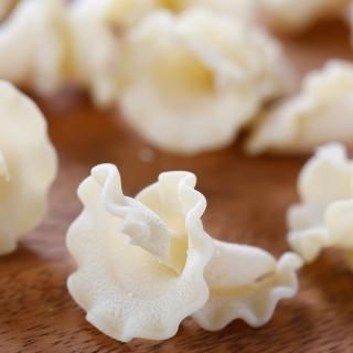 ■カンパネッレの名前は「小さな鐘」という意味。お花のようなドレスのような華やかな印象のパスタ。表面はツルツルでプリプリ。